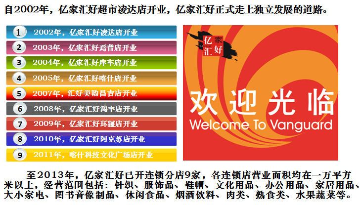 億家匯好商貿有限責任公司于2002年成立,并從臺灣引進連鎖經營職業(yè)管理團隊,統(tǒng)一管理旗下各地的連鎖超市。公司通過多年的穩(wěn)健發(fā)展,至2013年底,億家匯好商貿有限責任公司已成為擁有員工近3000多人,下轄一個配送中心和9家連鎖超市的大型綜合性零售企業(yè)??偨洜I面積11萬多平方米,配送中心輻射公司所有超市,年配送額可達2億元。公司大量吸納下崗職工,經過崗前培訓,提高勞動技能,實現(xiàn)了他們的再就業(yè),為維護社會和諧穩(wěn)定做出了貢獻。2013年,巴州億家匯好商貿有限責任公司在自治區(qū)零售業(yè)中穩(wěn)踞前三位,是自治區(qū)重要的流通龍頭企業(yè),2013年年銷售收入達10億人民幣。多年來,公司一直重管理、抓實效、運用先進的管理手段和營銷理念,秉承億家匯好人 時時尋求效率創(chuàng)新,事事講究專業(yè)技術的文化精髓,創(chuàng)造了良好的經濟效益和社會效益。公司先后多次被消費者協(xié)會評為誠信單位,并多年被評為重合同,守信用單位。